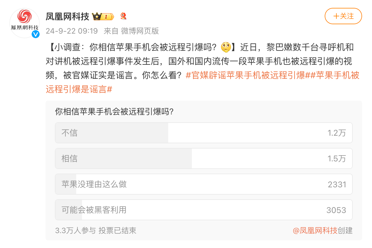 9月22日,凤凰网科技发起一项线上投票,共有3.3万人参与。其中,相信iPhone“会被远程引爆”的人有1.5万,占比位居第一。[2]